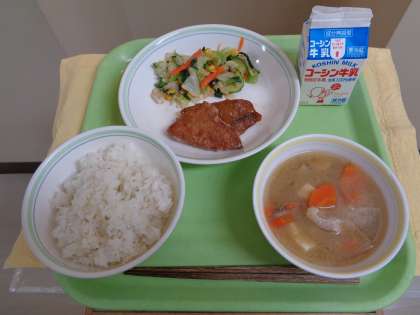 麦ごはん かつおの揚げ煮(2切れ) 野菜のゴマドレッシング 具だくさんの味噌汁 牛乳