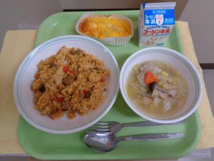 ジャンバラヤ ポテト入り玉子焼き キャベツとベーコンのスープ 牛乳