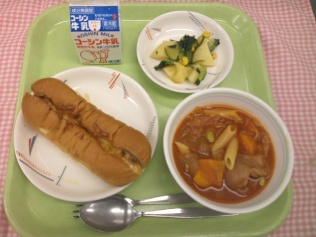 れんこんそぼろドッグ、ハニーサラダ、ペンネのトマト煮込み、牛乳 】