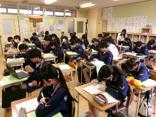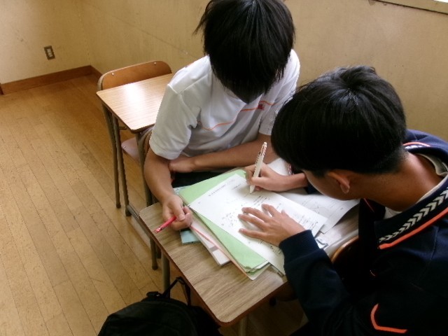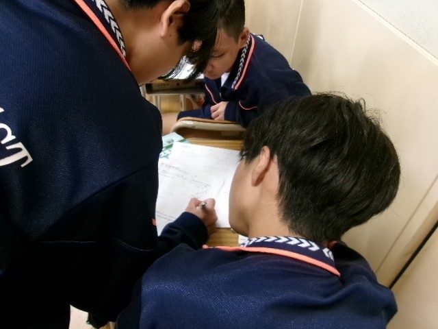 特に、一次関数と二次関数が交差する交点を結んだ線でできた図形の面積を求める問題が難しそうでした。仲間と関わる活動の際、あるグループでは8年生で学習した「等積変形」を用いて、簡単に面積を求める方法で解答を導いていました。受験当日は1人で挑む制度となっていますが、日々の学習では、こうした級友との関わりで力が身についていくと思いました。