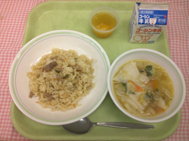 【焼き肉 チャーハン、★ワンタンスープ、オレンジゼリー、牛乳 】