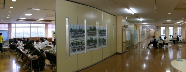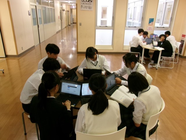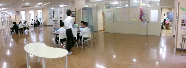 中でも8年生フロアーでは、学習空間を活用・工夫して、学習を進めている教科があります。今日は、国語の課題をスライドで作成するために、自分自身で学習進度の目標を立てながら勉強する姿が見られました。