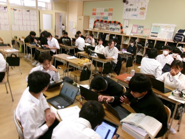 この日、8年生国語では、説明文に関わるテーマについて、発表資料の作成を行いました。はじめに自分で進度目標を定め(Self)、どのように取り組むか(Select)を決めます。その後、情報収集、分析、資料整理を進めていました。板橋区ではこの学習方法を「板橋区授業スタンダードS」と定義し、生徒の主体性を伸ばす試みを推奨しています。