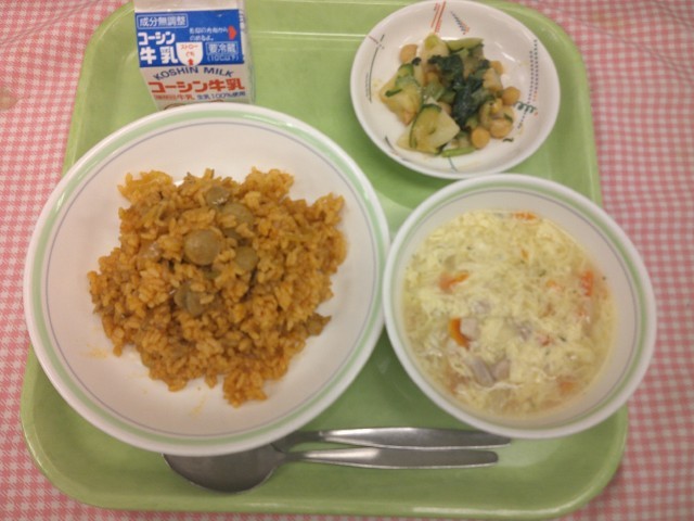 【ジャンバラヤ、卵スープ、ビーンズサラダ、牛乳】