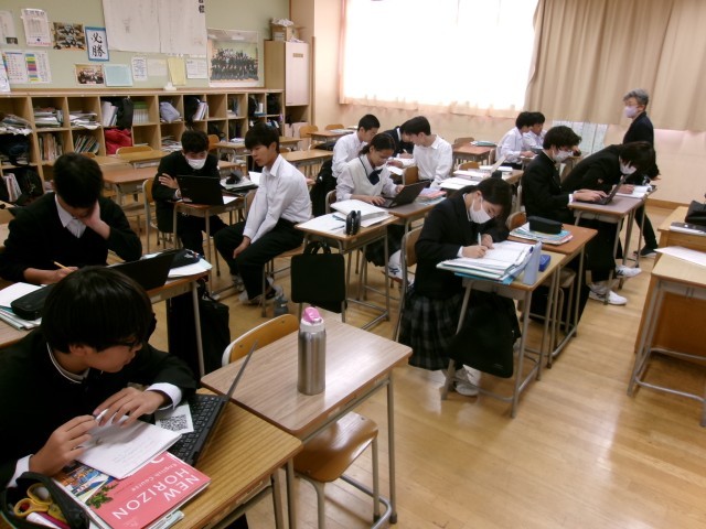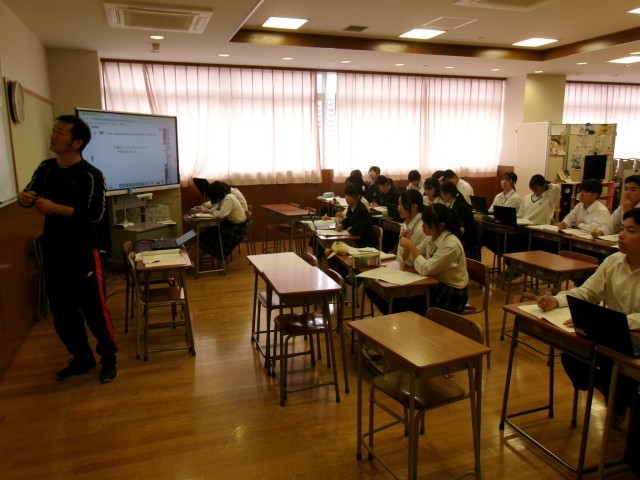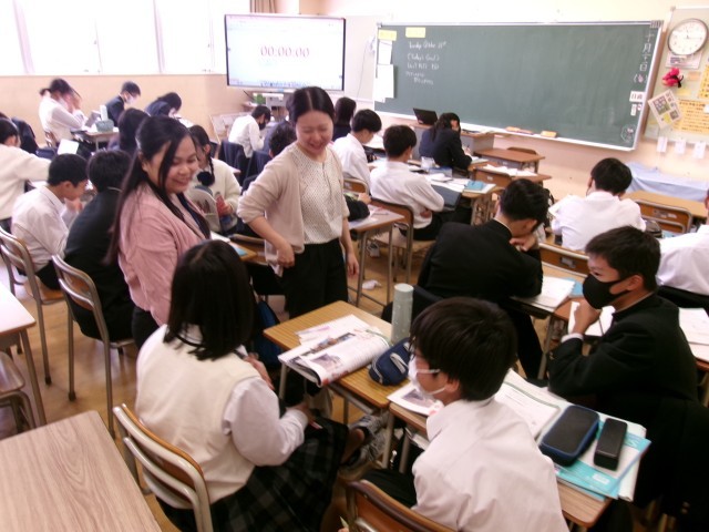 テキスト本文の内容である「ユニバーサルデザイン」について、プレゼンテーションを行うかのような表現方法で学習している姿が印象的でした。どのクラスでも、生徒の声が響く授業が行われていました。