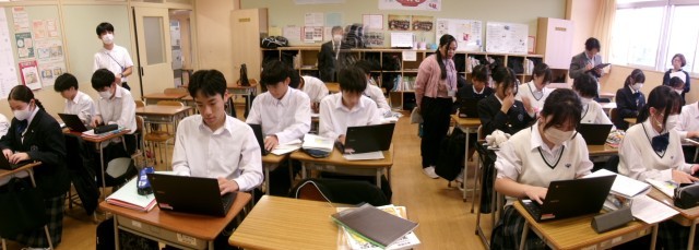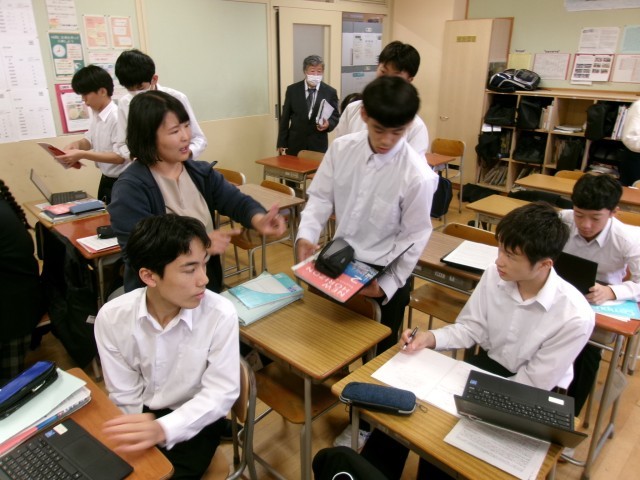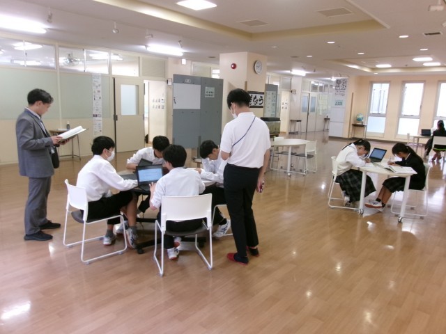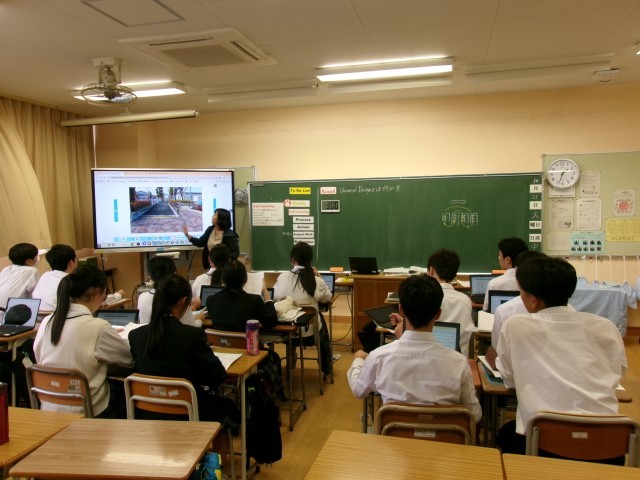 ユニバーサルデザインに関わる考察について、マッピングでイメージしながら文章構成を整え、英語で仕上げていきます。見方・考え方は様々なので、生徒数分の英文を互いに検証し合う時間では、傾聴の姿勢、自分が工夫したこと、難しかったことなどを共有しました。英語を通じて、人間性も磨かれていく展開でした。