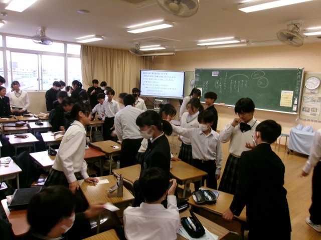 道徳は各教科と異なり、多様な見方・考え方が散見される点で魅力があります。例えば、共通課題であっても導かれる意見や感じ方は人によって様々。個人考察ではAだった考えが、仲間との意見交換によってBになることも。場合によっては、「やっぱり私は、Aだと思う!」ということを再確認することさえあります。そこで大切になるのが、「語りと傾聴」。好ましい他者との交流によって、7年生の声が廊下にまで響いていました。