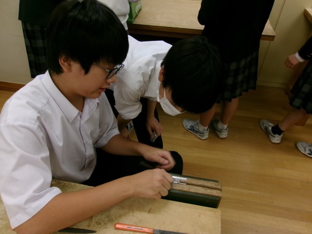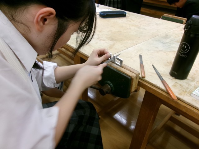 今日は、キーホルダーとなる金属板のデザインを加工する工程でした。やすりや電動のこぎり、万力などの道具・機械を活用し、イメージの形に仕上げていきます。細かい部分の作業は、先生や級友からアドバイスをもらいながら、丁寧に進めていました。