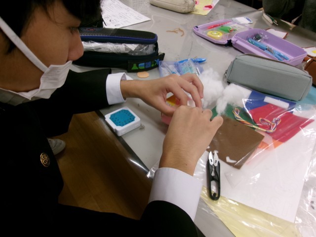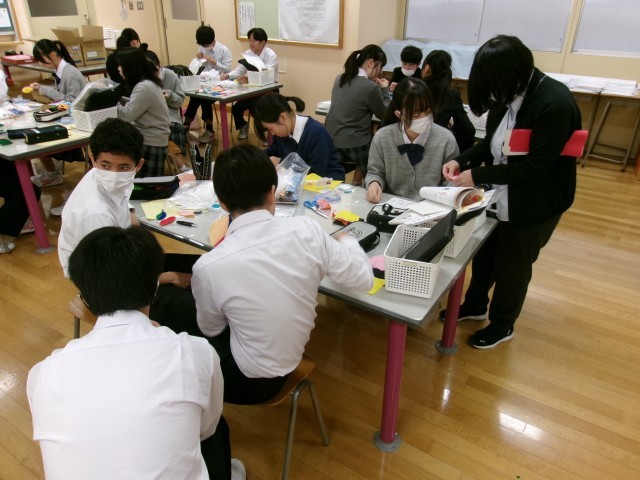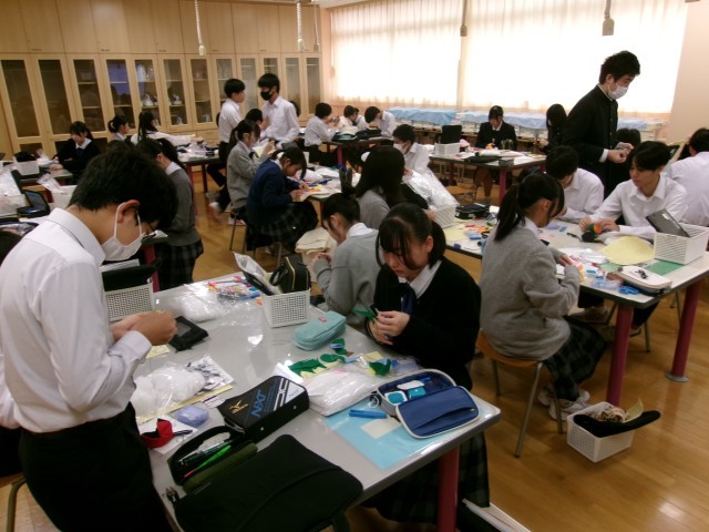 この日、家庭科では最後の単元として、幼児の生活を扱っていました。現在は、幼児にとっての遊びの意義を理解するため、実際に「おもちゃづくり」の制作を進めています。幼児の手に合う大きさや視覚的な色合い、肌触り、弾力性など、人との関わりを感じながら作業を進めているやわらかい表情が印象的でした。