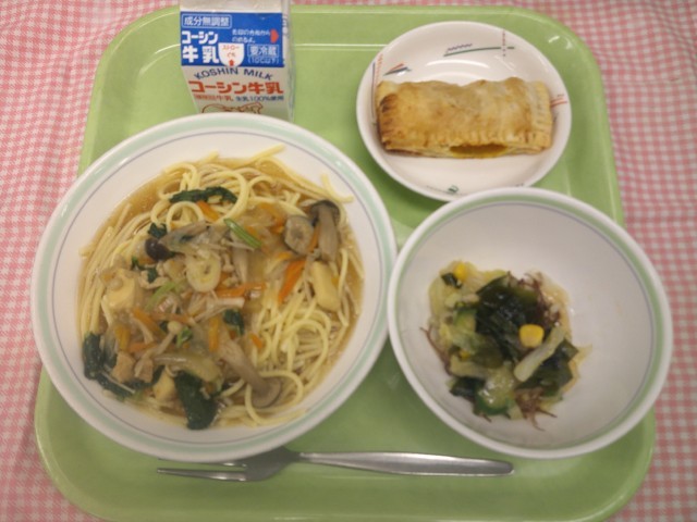 【スープスパゲッティ、海藻サラダ、パンプキンパイ、牛乳】