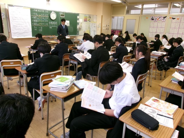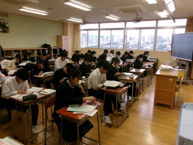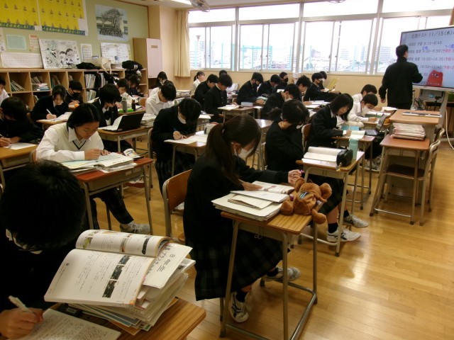 朝、いつもより早めに登校する生徒が目立ち、教科書やノートを開きながら登校する姿も見かけました(自動車・自転車に十分気をつけてください!)。朝の連絡を終えると、教室では試験時間までの1時間を有効に活用していました(写真は8年生)。