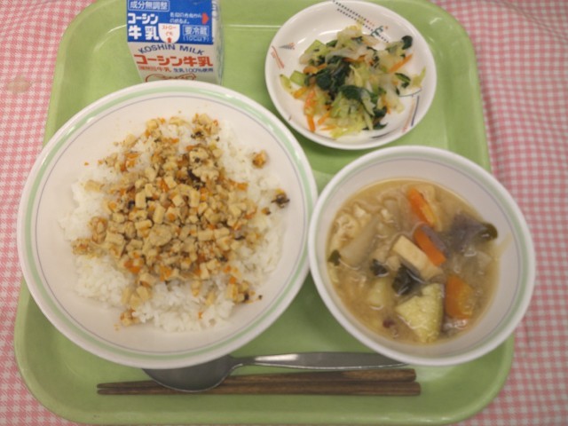 【鉄分強化献立:高野豆腐のそぼろ丼、青じそ和え、味噌汁、牛乳】