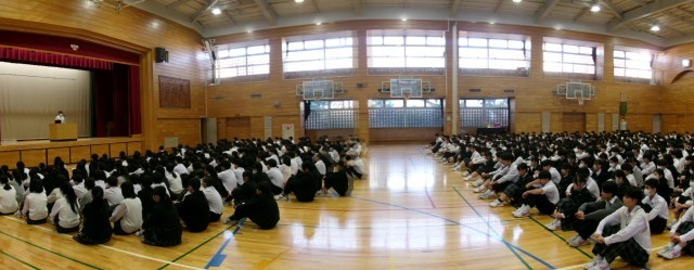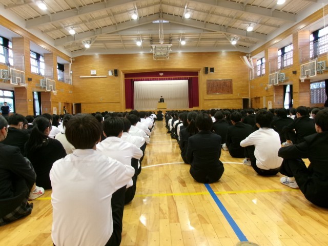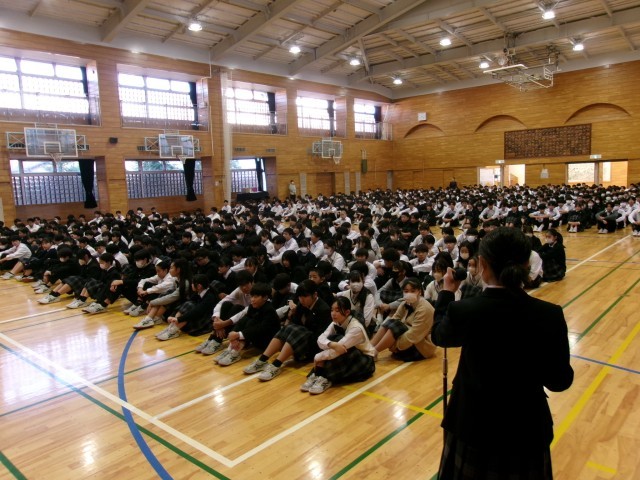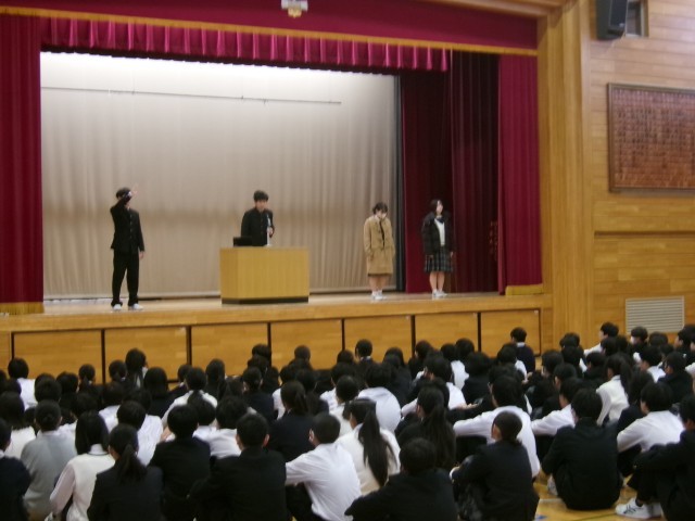 今日の話題は、来週に予定されているボランティア活動について、下校時間について、正しい防寒着の着方について、などでした。中央委員会での検討事項を代表生徒が堂々と伝えている姿からは、自治的な活動の意義を感じとることができました。