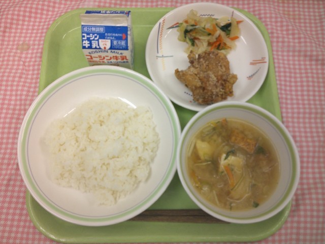 LUNCH TIME通信No.113 公開日 2025/11/18 更新日 2025/11/18 LUNCH TIME 通信 【ご飯、★鶏の唐揚げ、おひたし、五目汁、牛乳】 ★鶏の唐揚げはリクエストメニューです。鶏もも肉の切り身に下味をつけ、でんぷんと米粉をまぶして油で揚げました。ニンニクや黒こしょうが効いていて、食欲をそそる味付けです。