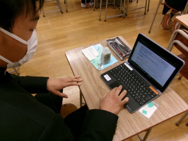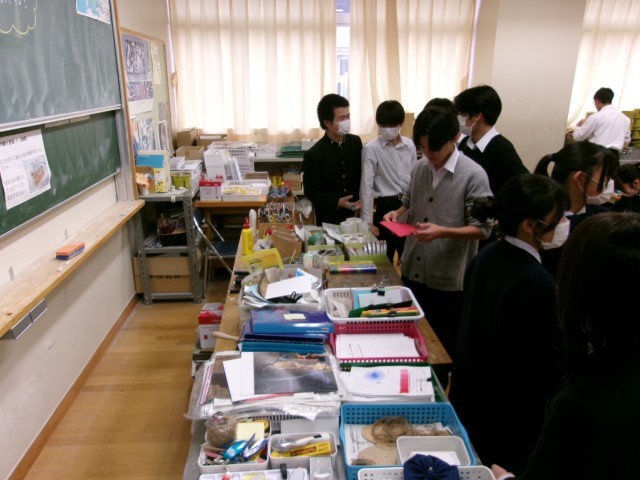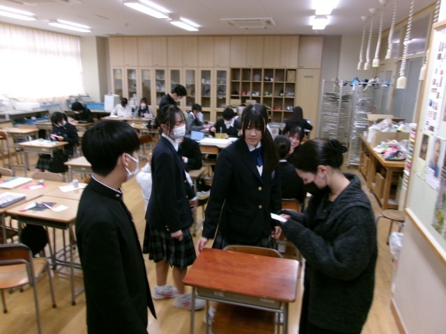 今日は作品展示に合わせて、台紙にタイトルと作者の思いを言語化しました。ある生徒のタイトルは「挑戦心」。あえて、不安定でいびつな形に造形することで、思春期を過ごす今を表現していました。国語や他の教科で身につけている思考整理法を活用しながら、限られた字数に思いを込めました。