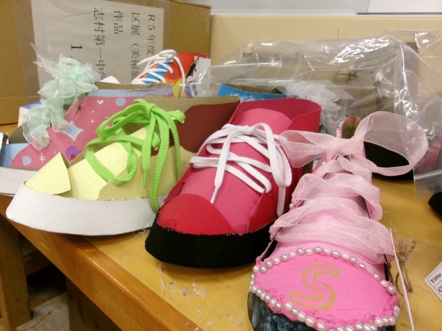 8年生美術では、紙型でつくる「靴」の製作が終盤を迎えています。