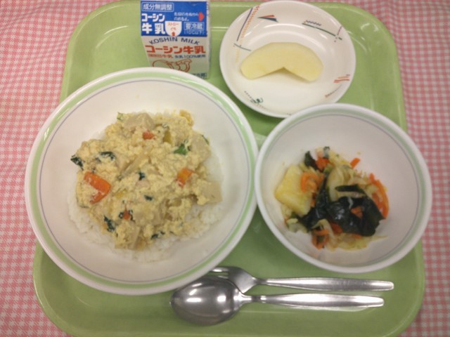 【高野豆腐の卵とじ丼、おろしあえ、りんご、牛乳】