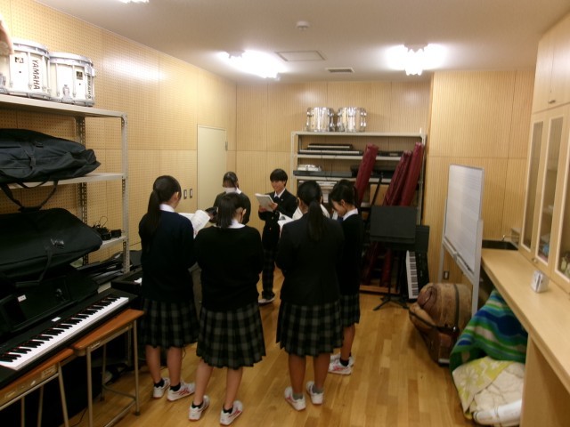 音楽室から聞こえてくる大人びた声。予想通り、9年生がパート練習を3部に分かれて行っていました。先生が別のパートの指導をしている間も、生徒同士で楽譜を見ながら、音程、リズム、曲想を感じながら歌っていました。主体的に学ぶ雰囲気が最上級生の魅力の1つです。