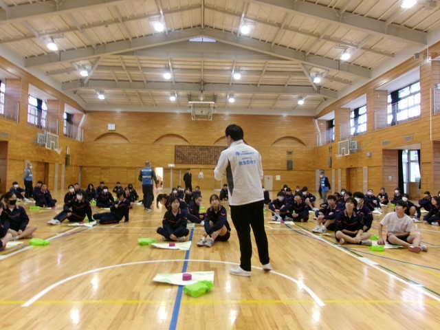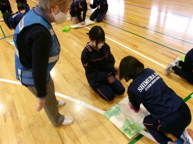 人命救助の観点から、主に心肺蘇生とAED使用についての実習を行っています。心肺蘇生では、救急車が到着するまでの平均時間約8分の間、1人で心肺蘇生救助を行うことが困難であることがわかりました。また、AED使用では、誰でも簡単に扱うことが可能であることを知りました。万が一の時には、中学生が人命を救うことを期待します。
