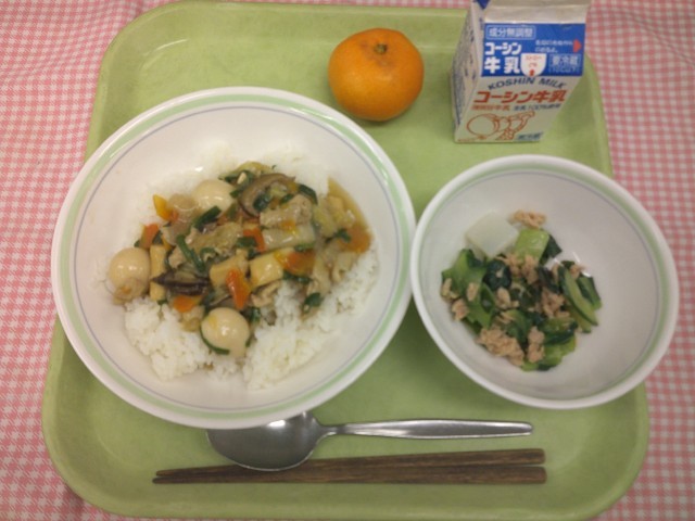 【中華丼 、ツナのねぎ塩サラダ、みかん、牛乳】