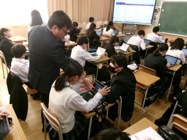 板橋区がすすめる【授業スタンダードS】に基づき、教員の指示ではなく、生徒が主体的に課題目標に沿って活動し、学習を進めていく授業でした。教員は時間管理や進捗状況を随時タブレットで把握できるので、個別的支援が十分行われている印象を受けました。