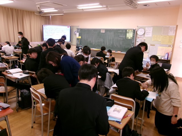 今日は平行四辺形の特徴を捉えるための考察を取り上げていました。「わからない!」という声が自然と発せられると、お互いの解法を伝え合っていました。多様な考え方に触れられる時間(学び合いタイム)が随時、設定されているため、わかるための粘り強さが学力向上に結びつく展開となっています。