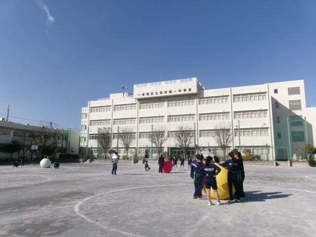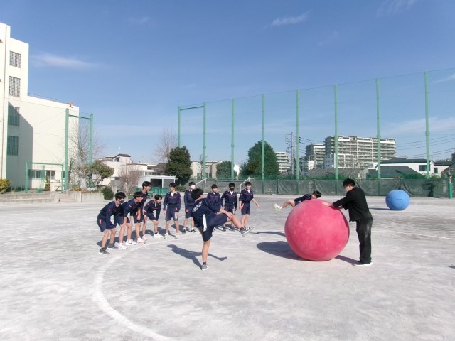 学習指導要領では、柔道、剣道、相撲が武道の単元に位置付けられています。本校には土俵はないため、「大玉」を活用して相撲を行っていました。武道では、「相手を尊重し、伝統的な行動を大切にしようとすること、一人ひとりの違いに応じた課題や挑戦を大切にしようとすること」などを目標として、授業が構想されます。この日は、「大玉」を土俵から押し出す形式にルールを変えた取組がおこなわれていました。生徒たち自身が主体的にルールを柔軟に変更する一方、立礼、蹲踞(そんきょ)塵浄水、四股、立ち合い、という伝統的な手順を守りながら相撲をとっていました。