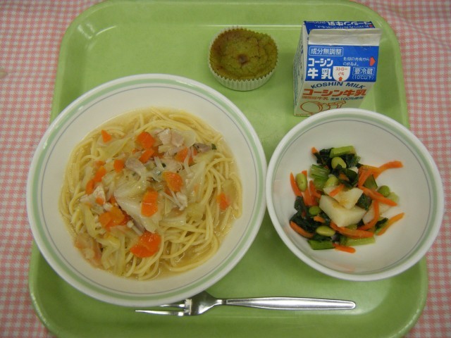 【キャベツのスープパスタ、じゃがいものオニオンドレッシングサラダ、 抹茶チーズケーキ、牛乳】