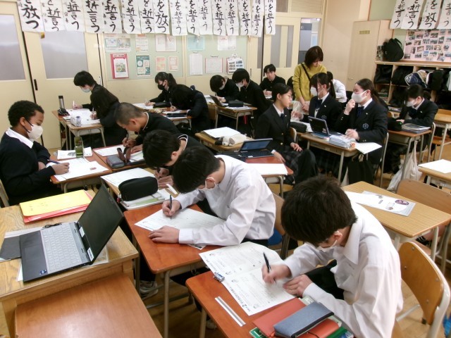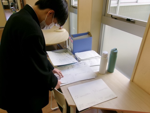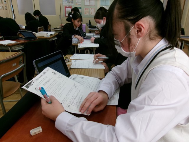 自分のペースに合わせて 公開日 2026/01/23 更新日 2026/01/23 できごと 8年生数学では、図形の証明を学習していました。 この時間にどこまで進めば良いかを確認した後、自分の習熟度に合わせて課題に取り組みました。わからない所は教材で調べたり級友や先生に聞いたりしています。早く課題が終わった生徒は、ひろば(教室前のスペース)に置いてあるプリントを取りに行き、自主的に難易度の高い問題に取り組んでいました。