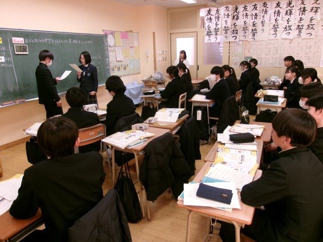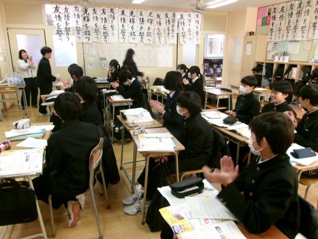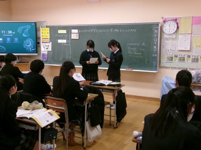 実際的な英語 公開日 2026/01/29 更新日 2026/01/29 できごと 8年生英語では、具体的な場面を設定し、ペアで会話していました。 May I help you ? を文頭に使いながら、「自分の好みや要望を伝えながら買い物をする」スキットでは、発音はもちろんのこと、流暢な会話や抑揚が目立っており、日々の学習の効果が十分に発揮されていました。