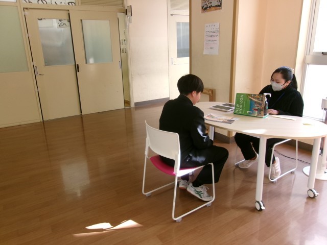ALT(外国人指導助手)の先生と1対1の環境でも授業と同様、堂々と会話している姿が印象的でした。自分の番になるまでは、単元の課題を進めて待っていました。