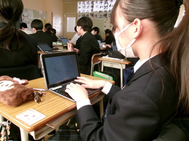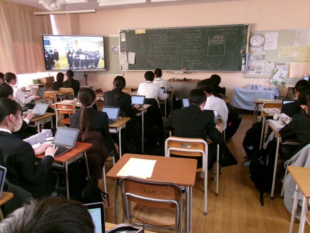 この日7年生では、各クラスの練習風景を動画に収めた映像を客観視する学習でした。技能だけでなく取り組み方や表情なども含めて、良かったところ、改善点などを出し合いました。