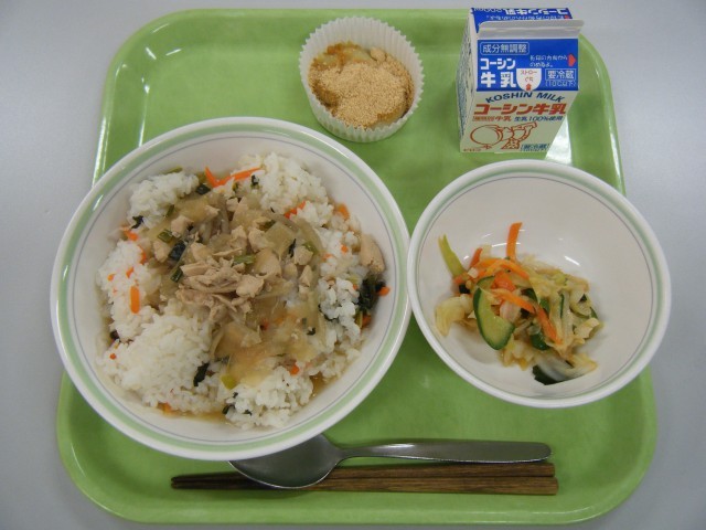 今日の給食は鹿児島県の料理です。鶏飯は、ご飯の上に彩りよく具材を並べ、鶏ガラでとったスープをかけていただく、奄美地方の料理です。給食では、配膳のしやすさを考えて、具をご飯とスープにまぜています。