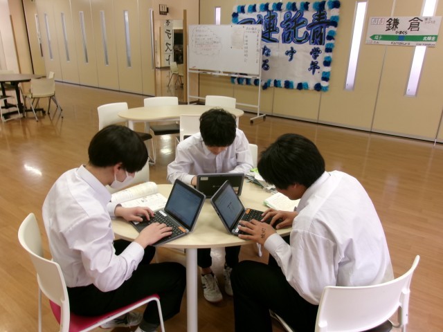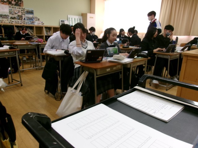この日8年生国語では、情報活用に関する課題学習していました。学び方、スピード、学習場所、参照資料といった要素は、生徒個々が判断、調整しながら学習していました。先生に言われてやるのではなく、生徒自身が自らの意思で学びに向かっている雰囲気を感じることができました。