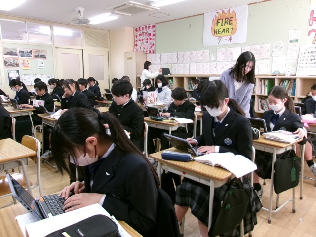 すでに学習した題材をもとに、指定された会話文2つを必ず使うことを条件とした物語を作っています。タイトルも自分で考えるため、物語全体を捉えた上での文章構成や表現力が求められる難しくもあり、楽しい課題でした。生徒たちは脇目も振らず、頭の中でストーリーを想像して、書いては消し、物語を創っていきました。