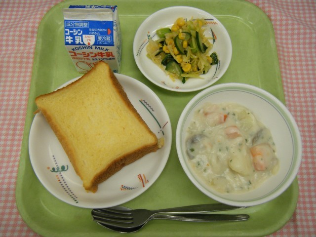 【フレンチトースト、コーンサラダ、ホワイトシチュー、牛乳 】