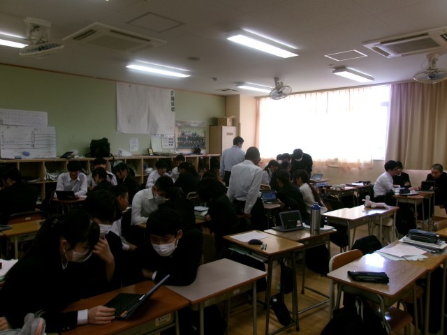 この日社会科では、8年生で使用が終わる地理的分野最後の授業でした。すでに計画した学習内容はすでに終えており、今日は地図アプリを活用した活動で、おおむね3~4人グループになりご当地クイズを含めた日本一周を旅するゲームを行いました。9年生では、歴史と公民が週に4回行われます。
