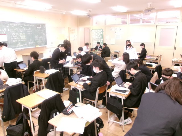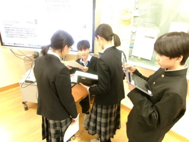 工夫された授業 公開日 2026/03/17 更新日 2026/03/17 できごと 7年生英語では、会話中心の学習を行っていました。 先生が難易度別に設定したミッションについて、教科書やタブレットを活用しながら解決します。先生のチェックを受けた後、次のレベルに移行する、という手順でした。4つのミッションをクリアすると修了証がもらえるようでした。