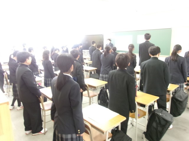 8時15分からの志一タイムに備えて、多くの生徒は5分前に教室に入っています。中でも新入生の7年生は、時間にゆとりをもって登校している姿が目立ちました。目と目をあわせてあいさつをしている、気持ちの良い朝をむかえています。(写真は7年生の朝の学活の様子)