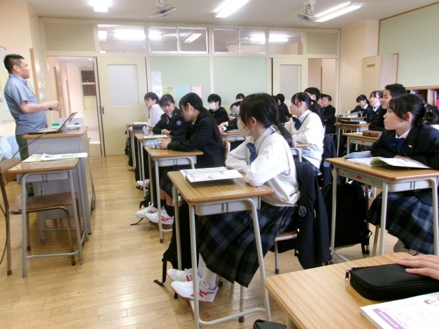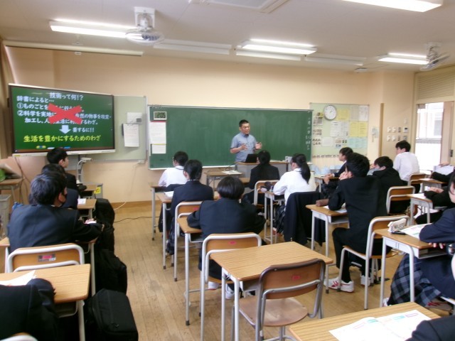 この日の技術では、中学校で初めて出会う教科・「技術家庭科」の定義から話題が始まりました。特に技術分野では、「大昔、人はきっと岩に座っていた。ある時、誰かが便利なイスを作った。」という事例をもとに、技術科の本質に迫りました。最終的には、技術とは「生活を豊かにするためのワザ」と定義し、生徒たちも熱心にメモをとっていました。