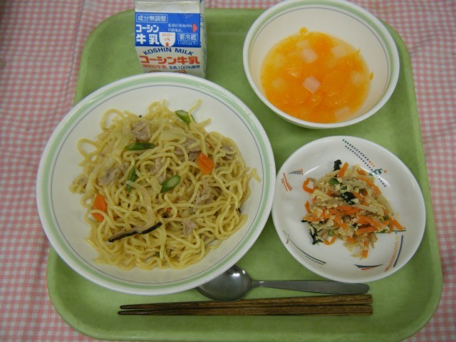 【春野菜の塩焼きそば、肉味噌いため、ナタデココみかん、牛乳】