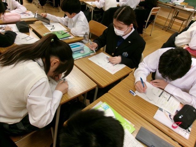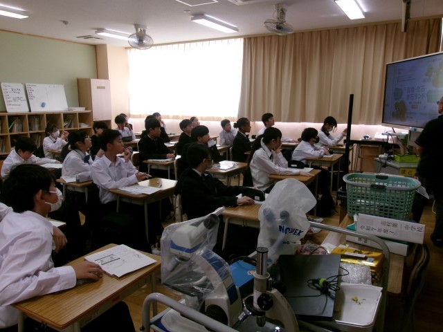よーく見て。 公開日 2026/04/20 更新日 2026/04/20 できごと 7年生理科では、生物の単元から中学校の授業が始まっています。 今日は、教科書資料や身近な植物を題材として、調査・観察の楽しさを味わう授業でした。実際に先生が採取してきたたんぽぽの花をルーペで注意深くのぞきこみ、スケッチをしました。