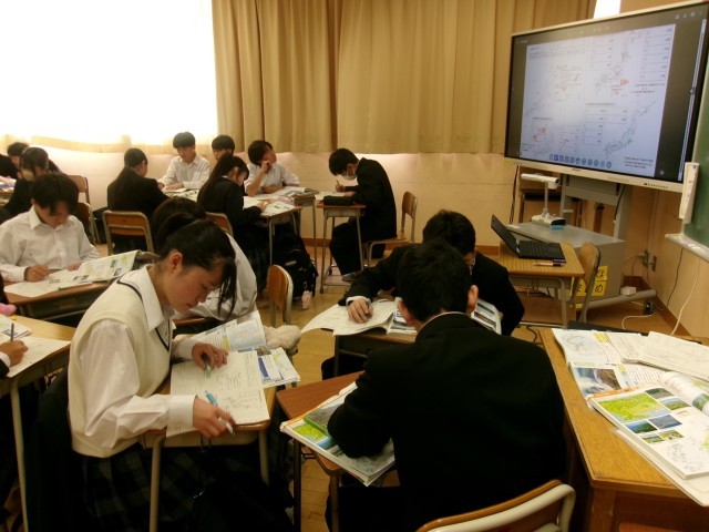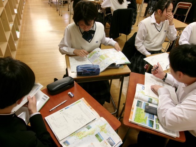情報収集 公開日 2026/04/20 更新日 2026/04/20 できごと 8年生社会科は地理的分野を学習しています。 今日は、今後、日本の諸地域を学習する前提となる日本列島の自然環境を大観する内容でした。地図帳片手に、山地・山脈、平野、河川などの名称を調べました。地名と歴史を関連付けて情報収集する生徒もいて、学びの質が高い授業となりました。
