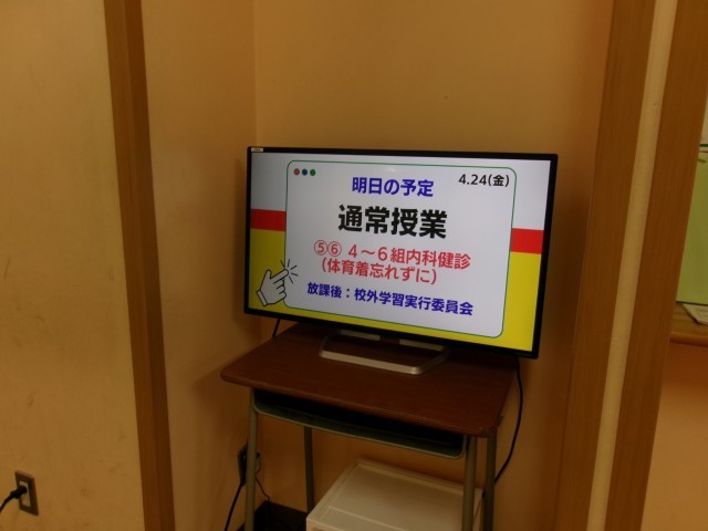 どのように使う? 公開日 2026/04/23 更新日 2026/04/23 できごと 本校は、デジタルサイネージモデル校として、実証検証を行っています。 4月土曜授業から試運転を開始していて、現在、各学年フロアで運用が始まっています。修学旅行情報や連絡事項、今日の予定、スクールライフ写真の1コマなどの映像が彩りを添えています。