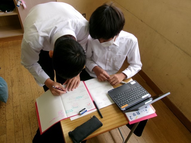 子どもの声が響く数学 公開日 2026/04/23 更新日 2026/04/23 できごと 子どもの声が響く学校にするためには、授業も工夫が必要です。 8年生数学は、参照する資料が多様に用意されています。そのため、わからないことを「わからないから教えて」という声が自然と聞かれます。今日は、単項式と多項式を織り交ぜた計算問題。わからないことは、①自力解決、②友達に聞く、③先生が用意したホームページを活用する、④デジタル教科書を活用する、などなど、生徒自身が自己調整しながら、学習が進んでいました。
