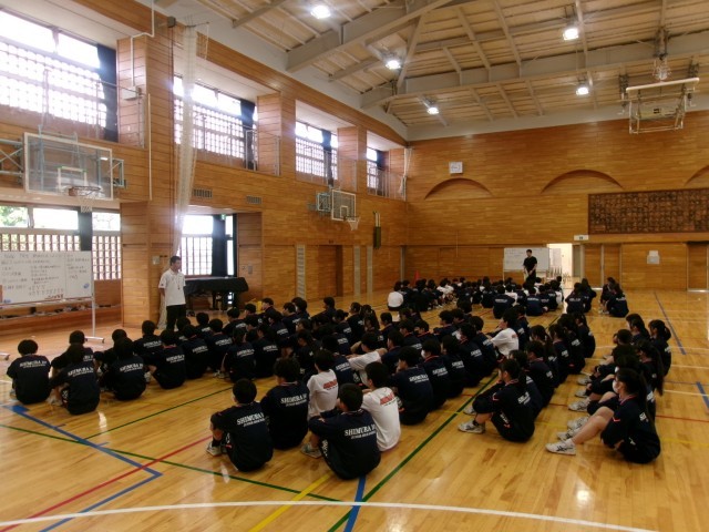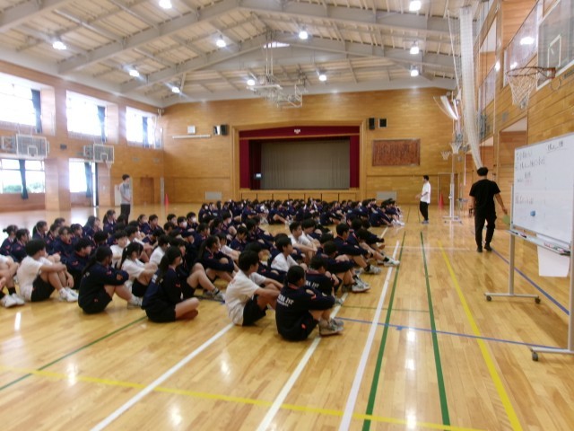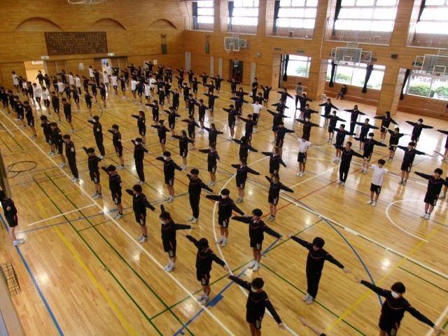 異学年での授業 公開日 2026/04/24 更新日 2026/04/24 できごと 昨夜の雨が校庭に残っていたため、1・2時間目の授業はアリーナで行いました。 本校は19学級とクラス数が多いため、1週間の中で必ずどこかの週時程(コマ)で、異なる学年の体育の授業が重なります。今日は、8年生と9年生が重なる日で、共にアリーナで新体力テストを行いました。8年生の目あてを見ると、「先輩のかっこいい行動を2つ見つけよう」と設定されていました。年長者の方が年少者から受ける刺激や学びが多いようでした。