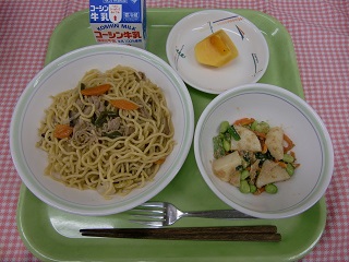 LUNCH TIME通信No.93 公開日 2021/10/12 更新日 2021/10/12 LUNCH TIME 通信 【塩焼きそば 薬味たっぷりサラダ 果物(柿) 牛乳】 めん料理は、具だくさんがオススメです!めんだけでは、たんぱく質やビタミンなどが不足して、栄養バランスが偏りがちです。うどんやラーメン、焼きそばなどのめん料理は、今日の給食のように肉や野菜、きのこなどを加えて具だくさんにしましょう!