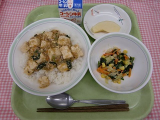 【麻婆豆腐丼 わかめサラダ 果物(りんご) 牛乳】