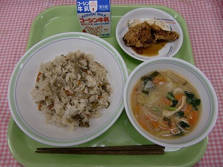 【きんぴらご飯 あじフライ みそ汁 牛乳】