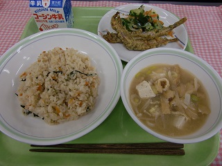 【そぼろ混ぜご飯 ししゃもののりごま揚げ 南蛮ソースサラダ みそ汁 牛乳】